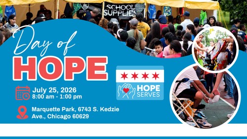 Since 2015, in partnership with CONVOY OF HOPE, we have hosted bi-annual, large-scale community events (8,000-10,000 guests of honor served in each event) in Marquette Park, Chicago. The event brings together local business, churches, and community service partners in a comprehensive day of service. Together we share a day of hope and resources: health and community services, veteran’s and job services, back-to-school haircuts, children’s shoes, and backpacks, as well as free lunch, a play zone for the kids, prayer tent, and free groceries.