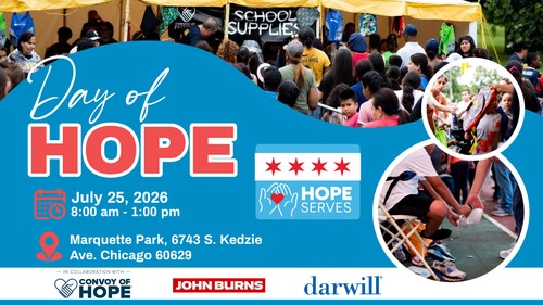 Since 2015, in partnership with CONVOY OF HOPE, we have hosted bi-annual, large-scale community events (8,000-10,000 guests of honor served in each event) in Marquette Park, Chicago. The event brings together local business, churches, and community service partners in a comprehensive day of service. Together we share a day of hope and resources: health and community services, veteran’s and job services, back-to-school haircuts, children’s shoes, and backpacks, as well as free lunch, a play zone for the kids, prayer tent, and free groceries.
