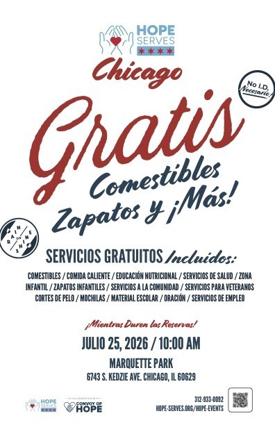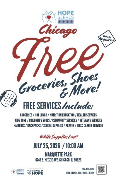 Since 2015, in partnership with CONVOY OF HOPE, we have hosted bi-annual, large-scale community events (8,000-10,000 guests of honor served in each event) in Marquette Park, Chicago. The event brings together local business, churches, and community service partners in a comprehensive day of service. Together we share a day of hope and resources: health and community services, veteran’s and job services, back-to-school haircuts, children’s shoes, and backpacks, as well as free lunch, a play zone for the kids, prayer tent, and free groceries.